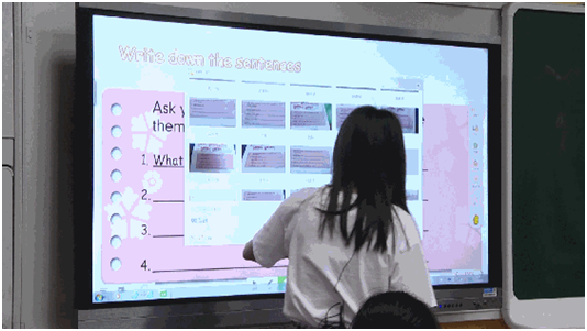 學生平板拍照分享到大屏,多位同學展示學習成果(支持四分屏)。