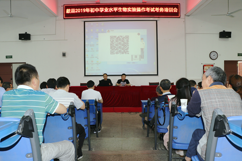 歙縣2019年初中學業水平生物實驗操作考試考務培訓會在新安中學召開。全縣36所初中教務主任和監考教師130余人參加培訓。縣教育局工委委員、副局長潘曙青到會指導。