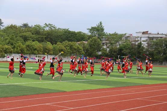 全南二中學生在表演“瑤族花棍舞”