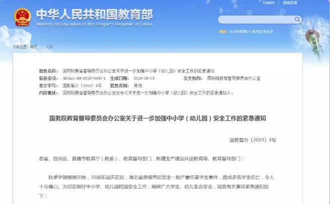 9月3日,國務院教育督導委員會辦公室發布了《關于進一步加強中小學(幼兒園)安全工作的緊急通知》(以下簡稱《緊急通知》)。