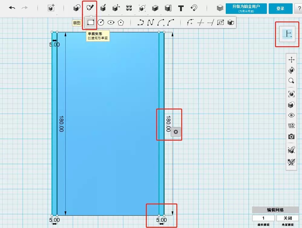 第二步:繪制支架,選擇上視圖,點擊矩形命令,在長方體表面繪制如圖所示的兩個矩形,尺寸:長118mm,寬5mm,即一個單元格。然后按住Ctrl,依次選中兩個矩形,點擊拉伸,拉伸高度160mm。