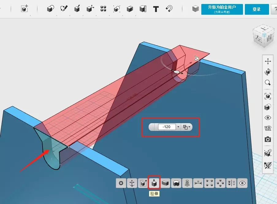第四步:繪制凹槽,選擇左視圖,點擊多段線命令,繪制如圖所示凹槽,(也可自由發揮)選中閉合圖形,點擊拉伸命令,拉伸長度為-120mm。