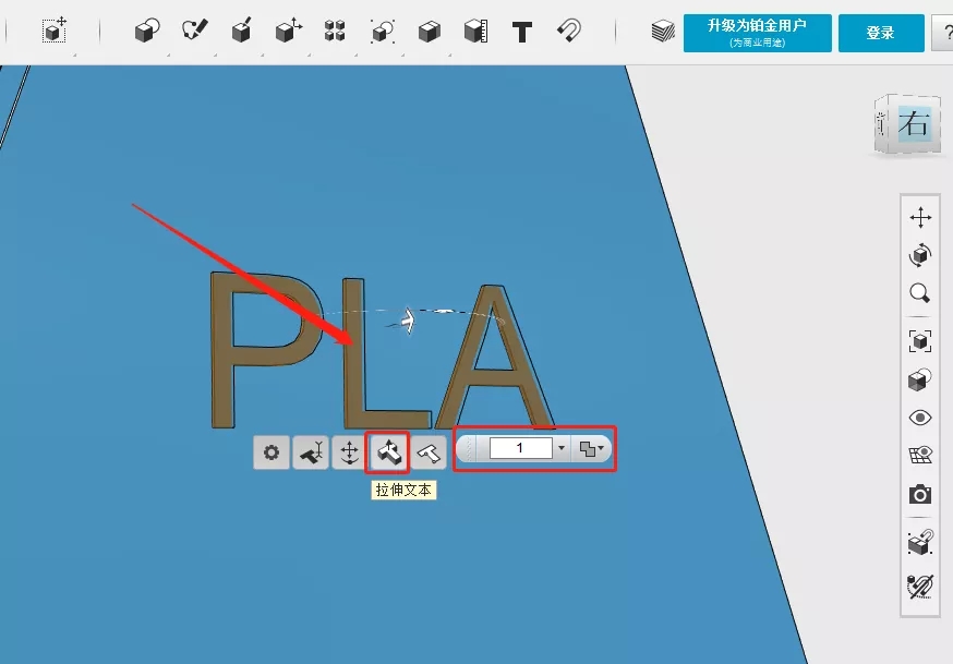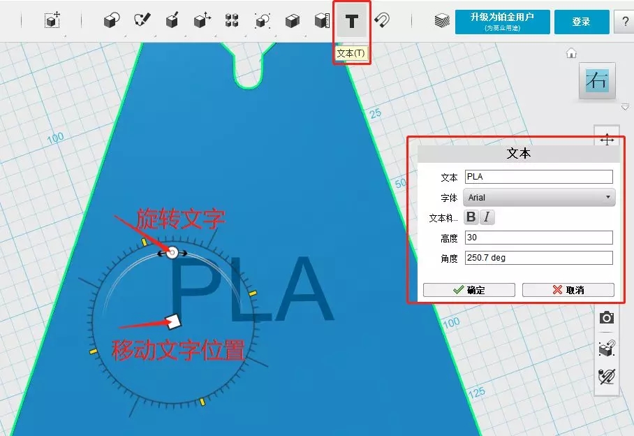 第五步:繪制文字,選擇右視圖,點擊文本命令,輸入PLA(當然也可以自己加喜歡的文字),調整文字高度為30,確定,然后選中文本,點擊拉伸命令,拉伸高度問1mm。