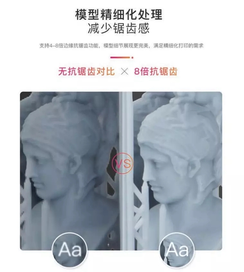 LD-002R系統(tǒng)支持4-8倍邊緣抗鋸齒功能,經(jīng)過(guò)專(zhuān)門(mén)的算法處理,可精準(zhǔn)地復(fù)原設(shè)計(jì)細(xì)節(jié),有效減少邊緣鋸齒現(xiàn)象,滿(mǎn)足精細(xì)化打印需求,使模型細(xì)節(jié)更光滑細(xì)膩,有效降低了后處理的難度和時(shí)間。
