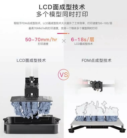 相較于FDM點(diǎn)成型技術(shù),LCD面成型技術(shù)大大提升了工作效率,打印速度為6-18s/層,最高70mm/hr的打印速度,支持一個(gè)物體多個(gè)模型同時(shí)打印,可全面提升打印速度,細(xì)膩還原每個(gè)真實(shí)創(chuàng)意。