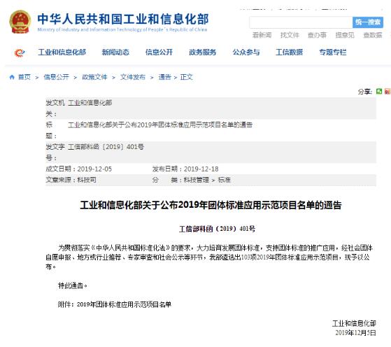 12月18日,中華人民共和國工業和信息化部發布《關于公布2019年團體標準應用示范項目名單的通告》(工信部科函〔2019〕401號),遴選出103項2019年團體標準應用示范項目。由中國教育裝備行業協會發布并歸口的團體標準T/JYBZ 005—2018《中小學教室照明技術規范》成功入選工信部2019年團體標準應用示范項目,見圖1。