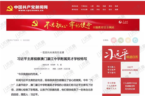 近日,國家領導人來到濠江中學附屬英才學校視察,了解教育現狀。領導人同師生們親切交流,觀摩了《“一國兩制”與澳門》的公開課,談到了“不忘歷史”和“文化自信”,并肯定澳門濠江中學附屬英才學校在教育上取得的成績。