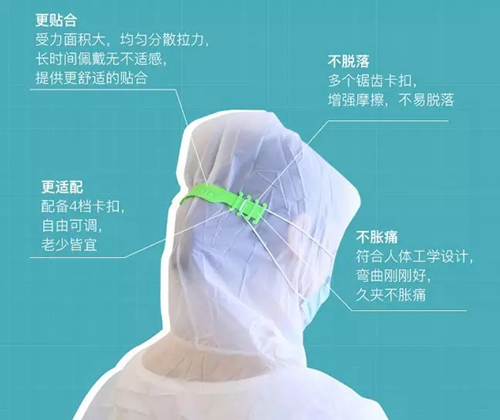 用TPU制成的口罩扣既能保證口罩佩戴過程中的強度要求,又能柔軟地貼合頭部表面,不產(chǎn)生勒痕,安全環(huán)保,對人體沒有毒副作用。由于是熱塑性塑料,支持除高溫高壓以外的所有消毒方式,消毒之后可以再利用。