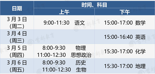 本次測試全市統(tǒng)一命題,統(tǒng)一考試時間,于3月3日-6日進(jìn)行。具體測試安排如下: