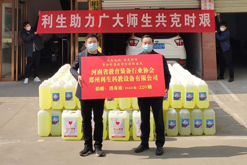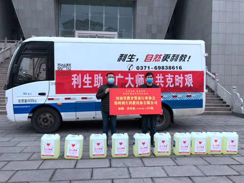 協(xié)會副會長單位鄭州利生科教設(shè)備有限公司在做好企業(yè)自身疫情防控的同時(shí),積極與慈善部門聯(lián)系,第一時(shí)間向慈善部門捐贈現(xiàn)金15萬元,并多方籌措了數(shù)十噸價(jià)值六十余萬元的84消毒液、紅外測溫計(jì),酒精等物資,準(zhǔn)備專車專人,疫情期間行程幾千公里,捐贈給鄭州市教育局、洛陽市教育局、開封市教育局、鶴壁市教育局、三門峽市教育局、金水區(qū)教育局、新密市教育體育局、新密市人力資源和社會保障局、洛陽市老城區(qū)教育體育局、洛陽市洛龍區(qū)教育體育局、許昌市魏都區(qū)教育體育局、襄縣教育局、禹州教育局、鄭州市二七區(qū)教育局、湯陰縣教育局、安陽市教育局、漯河市源匯區(qū)教育局、南陽市教育局等單位。目前,還有多個(gè)地市的教育系統(tǒng)正在積極對接中。