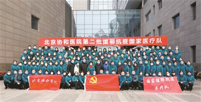 2月7日,北京協和醫院第二批援鄂抗疫國家醫療隊142名隊員在外科樓前合影。