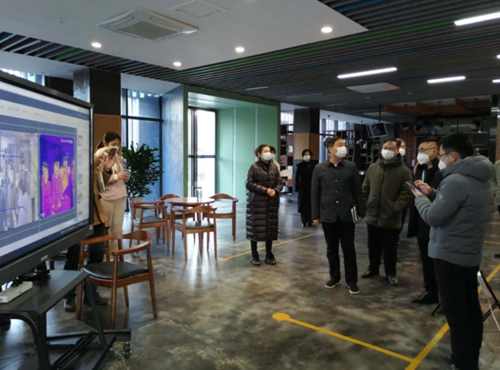 天立泰董事長丁旭東向督導(dǎo)調(diào)研組仔細匯報了公司復(fù)工復(fù)產(chǎn)、公司運行情況。疫情期間,天立泰復(fù)工復(fù)產(chǎn)通過“立式測溫人證一體機+校園疫情信息管理與防控平臺”、“熱成像相機和黑體+校園疫情信息管理與防控平臺” 等“無接觸”服務(wù)產(chǎn)品,有力地解決企業(yè)人群集中、排隊測溫的痛點,有力地保障了企業(yè)復(fù)工復(fù)產(chǎn)的平穩(wěn)運行。看到園區(qū)內(nèi)各項疫情防控措施到位、各部門工作開展秩序井然,高新區(qū)管委會副主任曹效記頻頻點頭稱贊。