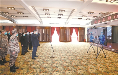 習近平通過遠程會診平臺,同正在病區工作的醫務人員代表視頻連線,詢問工作和保障情況。習近平強調,一線的醫務工作者最辛苦,承受著難以想象的身體和心理壓力,許多同志臉上和手上被磨出了血,令人感動,是新時代最可愛的人。我向你們表示崇高的敬意!習近平叮囑廣大醫務人員加強自我防護、抓住機會休息,既敢于斗爭、又善于斗爭。有關部門要落實好防護物資、生活物資保障,落實好工資待遇、臨時性工資補助、衛生防疫津貼待遇,盡快出臺關心關愛一線醫務人員的政策措施,幫助大家解除后顧之憂,確保大家以飽滿的精神狀態投入到工作中。