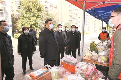 在社區生活物資集中配送點,習近平詳細詢問米面糧油和新鮮蔬菜水果等生活物資的采購和供應情況,強調要千方百計保障好群眾基本生活。在察看社區警務室、衛生服務站、物業中心等運行情況后,習近平來到社區黨群服務中心,了解社區實行網格化管理、聯防聯控、群防群治工作情況,對他們的工作表示肯定。