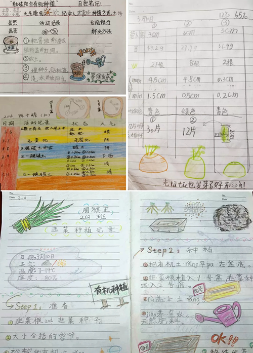 學生們改造容器、病蟲害防治,拍數字探究視頻,寫自然筆記,悉心照料,測量隴臺間距,株距,高度,顏色變化,計算是否澆透, 土壤含碳氮量,不同種子選擇采用的水培、有機土培形式,紅藍光線對植物生長高度的影響,利用魚菜共生、搭建垂直種植、創造有機種植產品,解決肥料、空間、水源等問題。利用手中鏡頭等多種形式來探究、記錄,蔬菜從種植到培育到生長的過程。一篇篇的自然筆記,一張張探究照片、一個個微視頻。打動吸引著小朋友們的好奇心,捕捉隨處可見的細微美好。