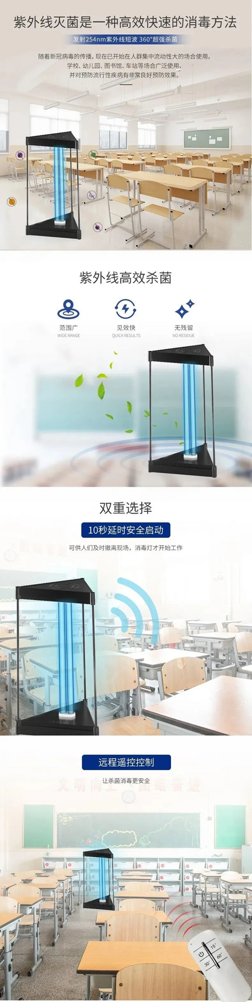 ●方案一:紫外殺菌燈,在無人條件下,能對教室等環境進行紫外線直接照射消毒殺菌;