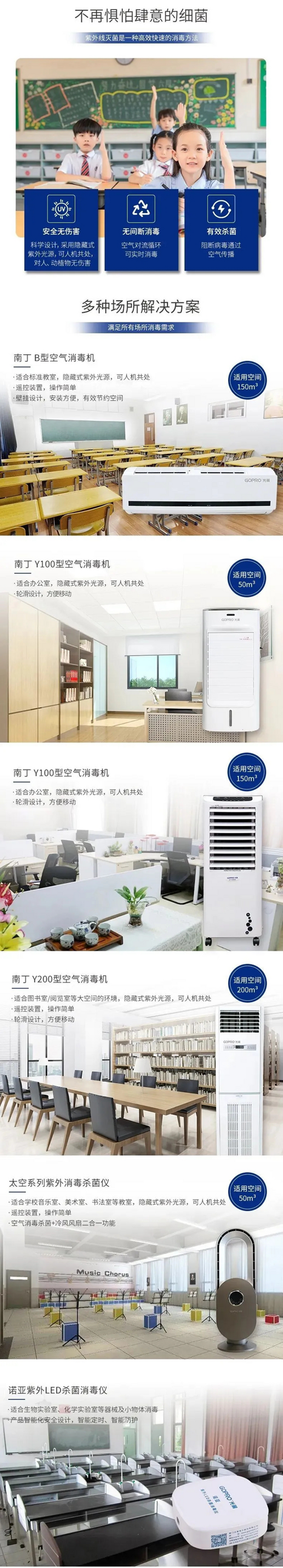 憑借深厚的技術積淀,光莆針對學校的特殊應用場景和要求,推出整體解決方案,可滿足不同教學場景的消毒殺菌需求。目前,光莆已在積極對接學校,爭取在開學前將紫外消毒殺菌產品安裝到位,為師生們的健康保駕護航。