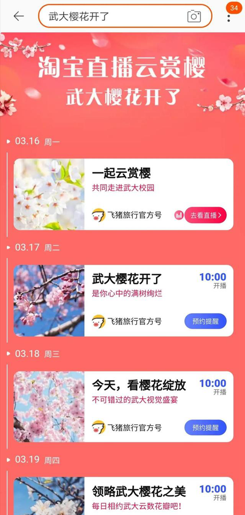 淘寶手機(jī)APP搜索“武大櫻花開了”,進(jìn)入直播間觀看