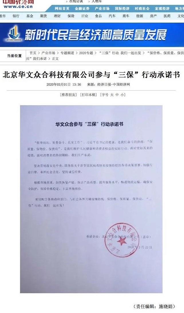 中國(guó)經(jīng)濟(jì)網(wǎng):北京華文眾合科技有限公司參與“三!毙袆(dòng)承諾