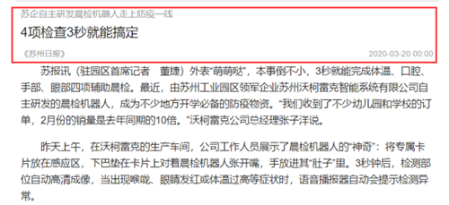 “外表“萌萌噠”,搭載了智能傳感器和深度學習算法,3秒就能完成溫度、口腔、手部、眼部四項輔助晨檢。最近,由蘇州工業園區領軍企業蘇州沃柯雷克智能系統有限公司自主研發的晨檢機器人,成為不少地方開學必備的防疫物資! 這段報道來自于《蘇州日報》。