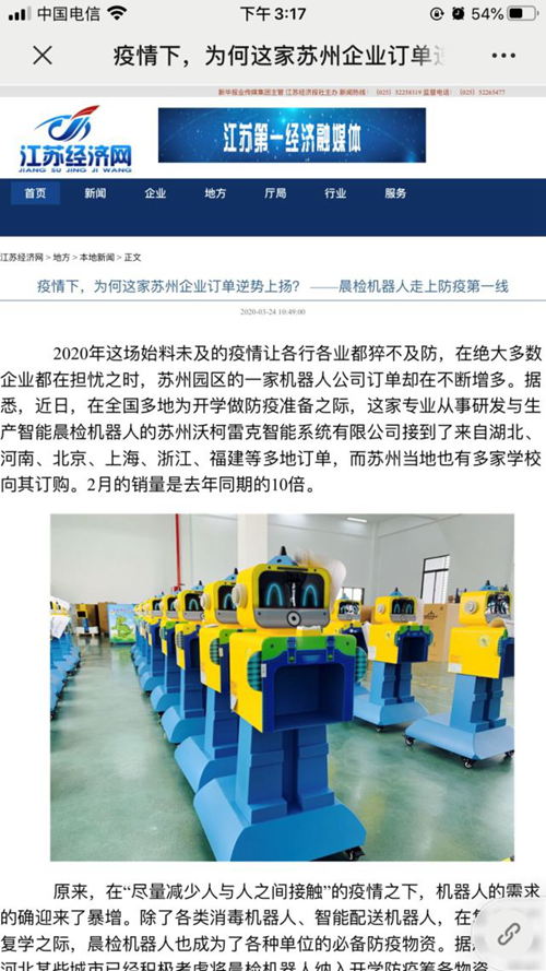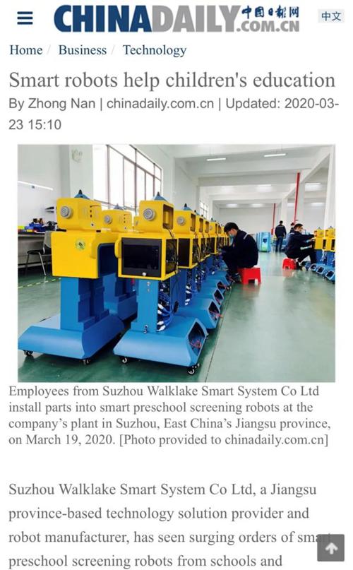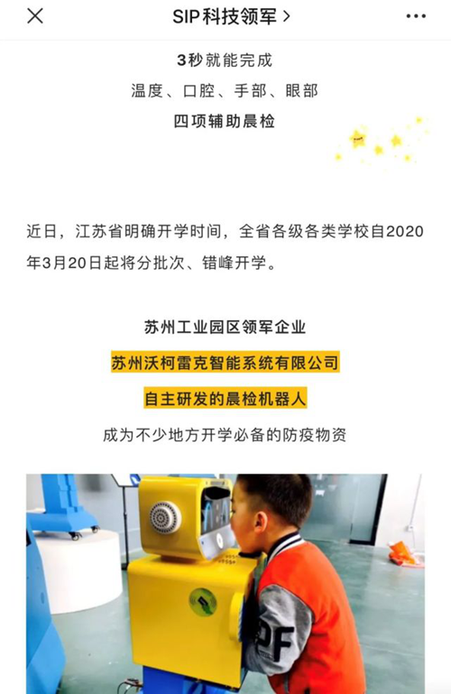 近期多家主流媒體官方報道了沃柯雷克晨檢機器人助力校園開學防疫相關新聞,如中國日報海外版、新華網、新華網海外版、網易新聞、江蘇經濟網、蘇州日報、蘇州新聞、聯播蘇州、SIP科技領軍相繼關注報道了沃柯雷克晨檢機器人在入園晨檢防控方面發揮的重要作用。