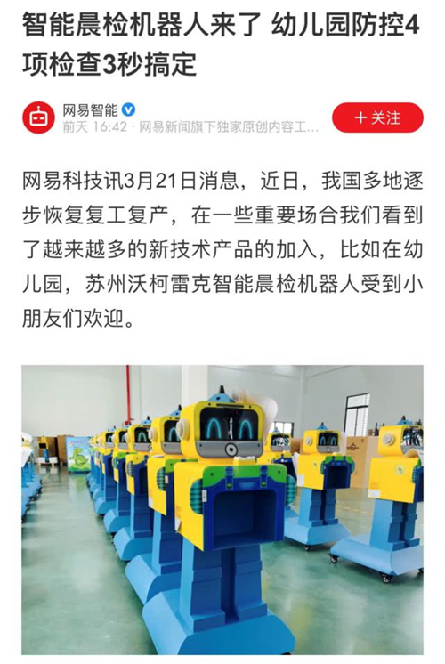 2019年,全國各地越來越多的幼兒園啟用了沃柯雷克晨檢機器人,良好的產品體驗+創新的科技晨檢模式使得沃柯雷克晨檢機器人在2020年初引發購買狂潮并獲得專業媒體的集體關注。