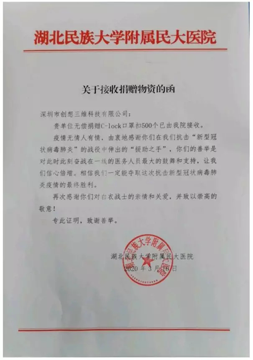 湖北民族大學(xué)附屬民大醫(yī)院在接受到我們的口罩扣后,非常感謝我們的關(guān)愛,并表示對我們的口罩扣十分喜愛,希望可以多贈送一些。