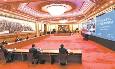 3月26日,國家主席習近平在北京出席二十國集團領導人應對新冠肺炎特別峰會并發表題為《攜手抗疫 共克時艱》的重要講話。新華社記者 李學仁 攝