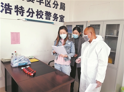近日,在北京四中呼和浩特分校的隔離室,校園疫情防控指導員指導校醫完善制度和防疫物品配置。本報記者 郝文婷 攝