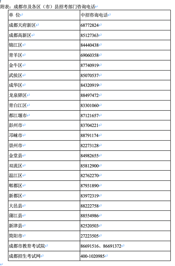 成都市戶籍、在市外就讀的應屆初中畢業生和希望在今年升學的成都市戶籍往屆生,均在戶籍所在區(市)縣招考部門報名,并參加后期各項考試。考慮到今年疫情的影響,為保障考生、家長的安全、健康,成都市已公布各區(市)縣招考部門的聯系電話,上述兩類學生只要在報名期間與戶籍地招考部門電話聯系即可,由招考部門電話指導學生做好相關材料的交驗、審核以及網上報名等工作。