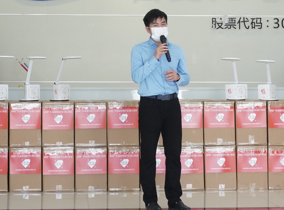 儀式上,拓享科技副總經理孫晉雄率先上臺發言。簡要介紹此次捐贈活動,并對雷曼總部的大力支持表示感謝。2020,是不平靜的一年,新冠疫情來勢洶洶,危急時刻,是無數一線醫護人員以生命鑄就防線,捍衛眾人的生命與健康。感懷于此,4月10日,在最后一批援鄂醫護人員平安返粵后,拓享科技與照明協會共同發起本次LED臺燈捐贈活動,以照明人的方式,致敬廣東省2495名援鄂醫護人員,用點點燈光,照亮英雄們的歸途。孫副總表示,在雷曼總部的大力支持下,在援鄂醫護人員奮斗精神的鼓舞下,未來,拓享科技也將堅定信心,努力推進企業發展,并長懷感恩之心,回饋社會。