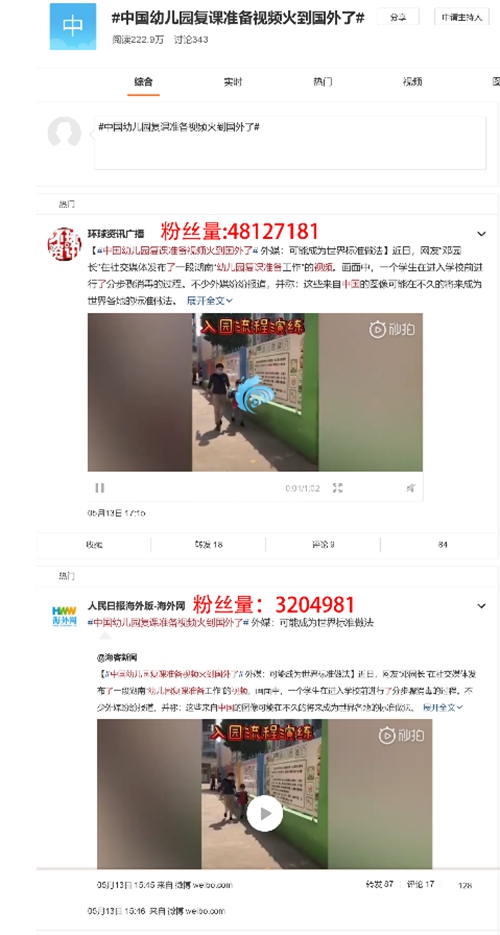 國外 推特、臉書平臺、崔娃脫口秀等知名外媒平臺播放量達2000萬人次,國內 抖音、嗶哩嗶哩、好看等視頻播放量也達幾千萬人次,隨后該視頻持續發酵引爆, 國內衛視如東方衛視、深圳衛視、海峽衛視紛紛關注報道,人民日報、網易、環球資訊、全景網等大V第一時間加入超話#中國幼兒園復課準備視頻火到國外了#,轉發報道該視頻,引爆全網!