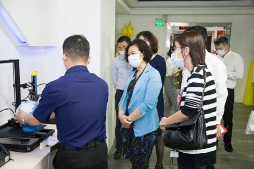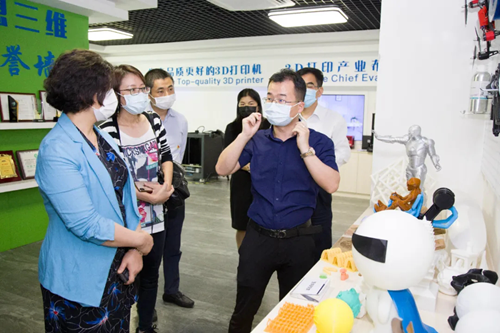 當天下午,創想三維聯合創始人劉輝林和敖丹軍對曾雪蓮一行的蒞臨指導表示熱烈歡迎,并先后帶領參觀了公司產品展示廳、青少年培育教室和總部辦公室。