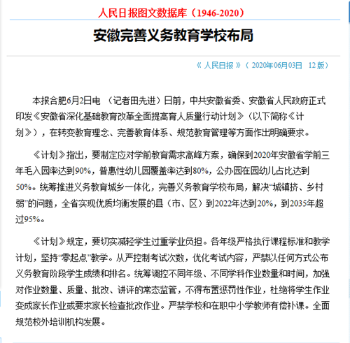 日前,中共安徽省委、安徽省人民政府正式印發(fā)《安徽省深化基礎(chǔ)教育改革全面提高育人質(zhì)量行動(dòng)計(jì)劃》(以下簡稱《計(jì)劃》),在轉(zhuǎn)變教育理念、完善教育體系、規(guī)范教育管理等方面作出明確要求。
