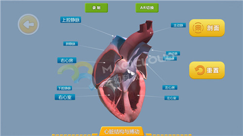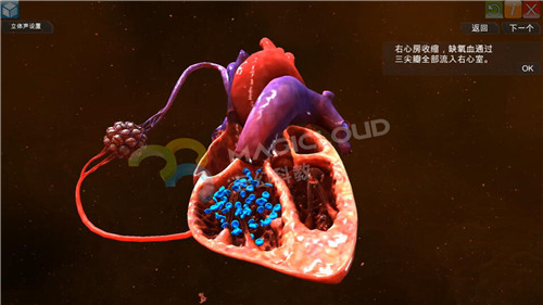 如《心臟和血液循環》課程中,云幻科教3D互動教學資源中,首先教師可以給學生展示3D教學視頻,跟隨著視頻了解心臟的結構、血液流動所經過的部位、形成的循環體系等等;其次再通過互動部分對心臟部位進行拆分學習,跟隨著血液經過的體循環與肺循環相關部位,對心臟和血液流動形成深刻的認識。學生不僅可以局部放大,還可以操縱鼠標使其在三維層面上任意方向任意角度的觀察。