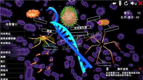 云幻科教3D互動教學資源中,《病毒》課程包含視頻、互動、練習三個部分,教師可以通過播放3D視頻讓學生們了解病毒的類型、結構、繁殖等相關知識,其次可以通過互動部分內容對病毒的結構進行拆解學習,了解每個部位的功能設置等,最后可以通過練習部分回顧本節課的主要內容以及進行測評,評估學習者本節課知識內容的掌握程度。