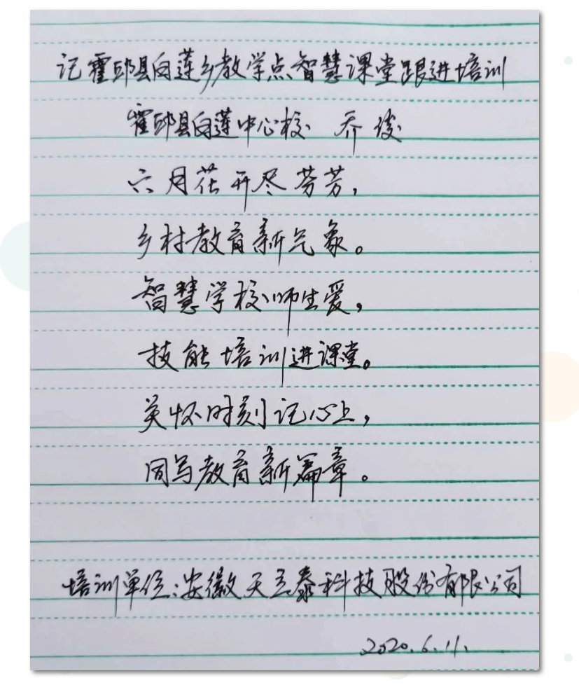 無論是天立泰智慧課堂軟件,還是培訓教師細致、耐心、專業的工作精神,都贏得廣大師生的一致贊譽。線下駐點培訓開始后,為教師及時解決平臺使用的技術問題,有求必應,有問必答,遇到突發狀況,還會遠程幫助教師迅速化解技術困境。他們是名副其實的在線教學“護航員”,用實際行動彰顯著敬業、奉獻與擔當!