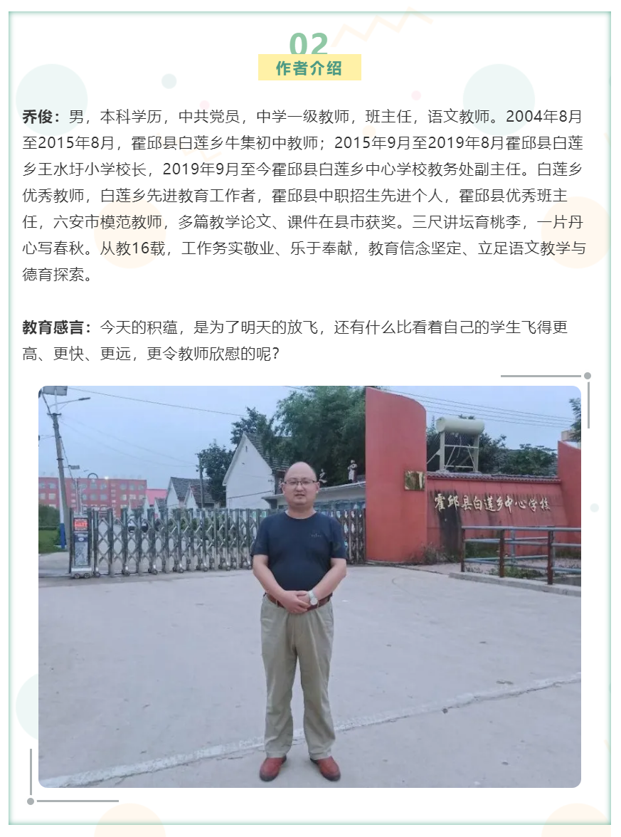 “只爭朝夕,不負韶華。不忘初心再出發;牢記使命勇擔當。我們都是鄉村教育的逐夢人,也將是無數學子的圓夢人。行動就有奇跡,堅持必有收獲。相信在白中人的共同努力下,白蓮鄉中心學校的教育之路定能越走越好,光彩絢爛!”,喬俊老師說道。