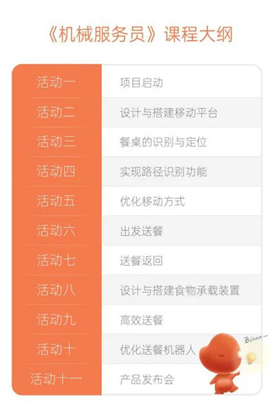 課程內容包括送餐機器人的移動機構的組成、巡線傳感器的工作原理、變量賦值、函數、嵌套循環和復合條件句等相關知識。