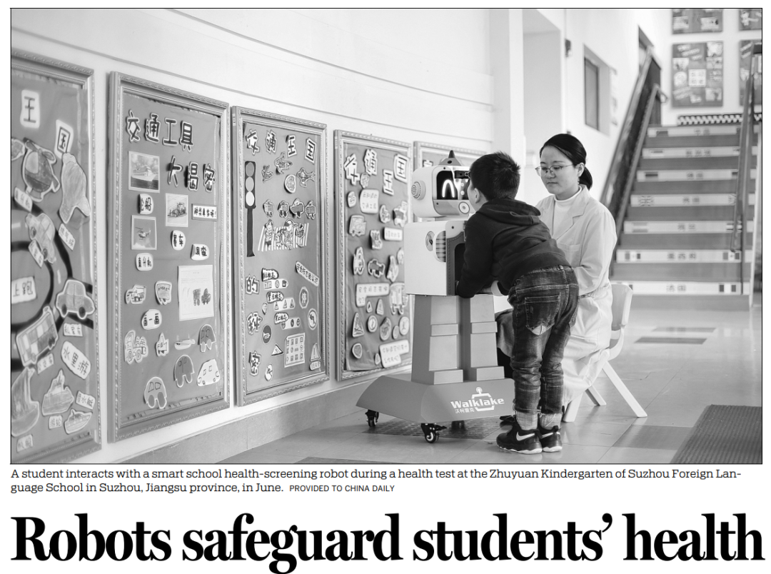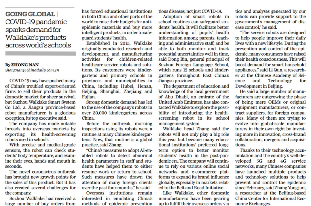 蘇州沃柯雷克晨檢機(jī)器人正在被全球媒體聚焦。7月13日,《中國日報》以《Robots safeguard students' health》為題,主版頭條刊發(fā)了對沃柯雷克晨檢機(jī)器人助力復(fù)學(xué)的報道。這也是繼3月23日中國日報國際版刊發(fā)對沃柯雷克晨檢機(jī)器人助力中國校園防疫復(fù)學(xué)的報道后,官方媒體再度“點名”沃柯雷克晨檢機(jī)器人。