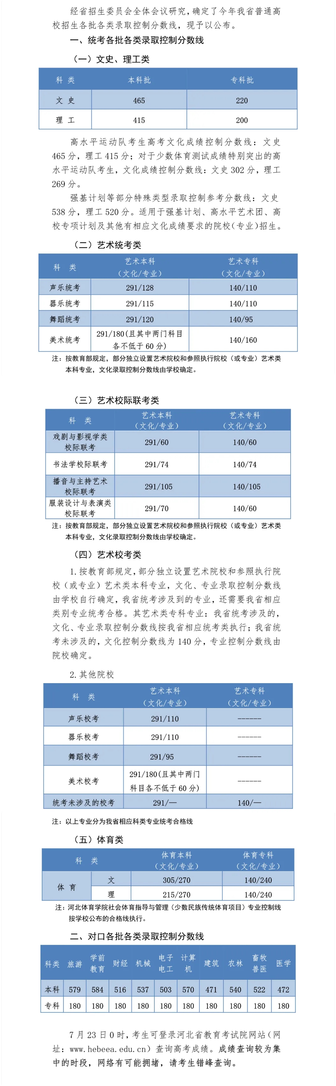 2020年河北省普通高校招生各批各類錄取控制分?jǐn)?shù)線