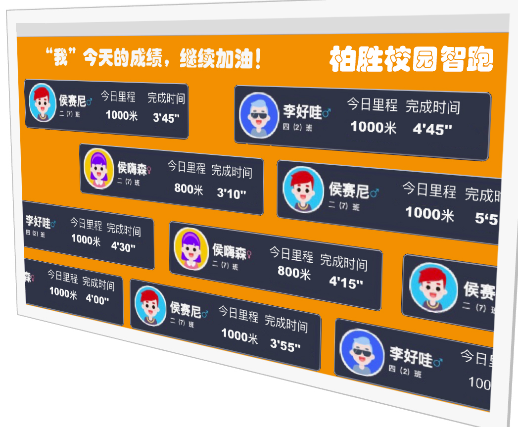 在體育展示區安裝大屏交互區,排行榜實時記錄學生運動步數排行,分為日排行、周排行、月排行等,可最大限度激發學生好勝心與競賽精神,帶動學生參與運動。
