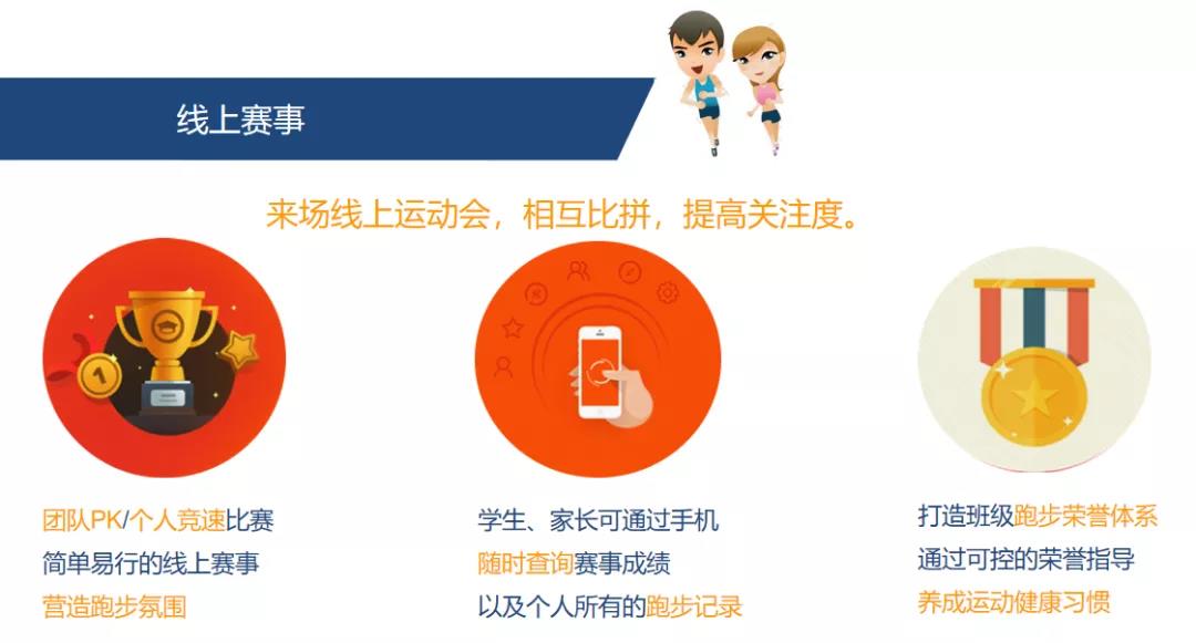 智能計時系統與數據統計分析可高效幫助學校老師對學生進行日常體育訓練及測試,大數據可實現學生體育管理與體育優化。步數排行榜功能及線上豐富活動可全面激發學生體育興趣,讓學生愛上體育運動!