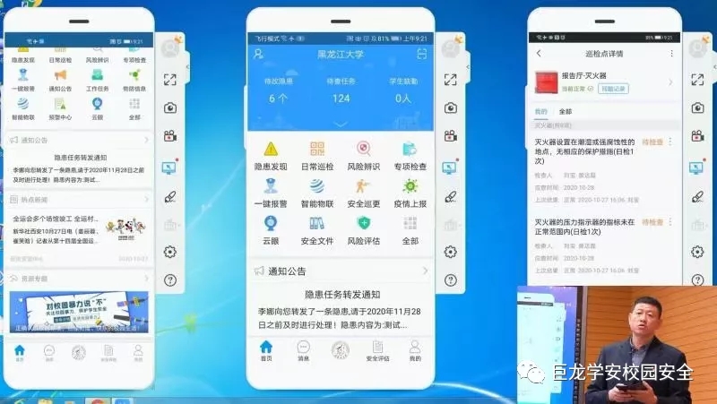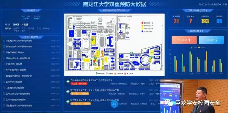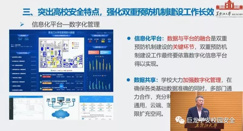 與會期間,參會同志集體觀看了黑龍江大學風險分級管控和隱患排查治理雙重預防機制創(chuàng)建視頻紀實片,黑龍江大學校長付宏剛介紹了本校學安雙重預防機制的建設(shè)經(jīng)驗,黑龍江大學安全保障部副部長劉寶現(xiàn)場實操演示學安雙重預防體系。