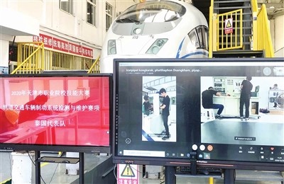 在天津鐵道職業技術學院承辦的“軌道交通車輛制動系統檢測與維護”賽項比賽現場,來自全市多所職業院校的21名選手正在緊張地比拼中。在現場設立的大屏幕的另一端,泰國“魯班工坊”代表隊的國際選手們,也在專心致志地操作著手中的設備。該賽項的比賽設備由天津鐵道職業技術學院與天津驥騰科技有限公司共同研發,其申請專利已經被國家知識產權局受理,并作為首屆泰國全國軌道交通職業技能大賽中指定大賽裝備。這也是我國首次向泰國輸出中國技能大賽標準及中國大賽使用設備。