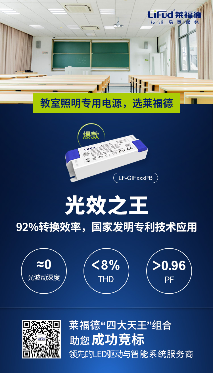 LF-GIFxxxPB作為萊福德專為非智能教室照明改造打造的新品,PB系列擁有極高的轉轉換效率,優異的THD、PF值,是有嚴苛改造要求的教室照明項目首選產品。