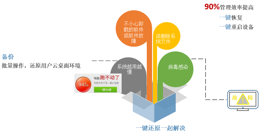 針對(duì)電腦系統(tǒng)越用越慢和多個(gè)老師、學(xué)生公用黑板導(dǎo)致設(shè)置、桌面經(jīng)常被改的問(wèn)題,可使用極速云對(duì)桌面系統(tǒng)重啟還原,體驗(yàn)始終如新。