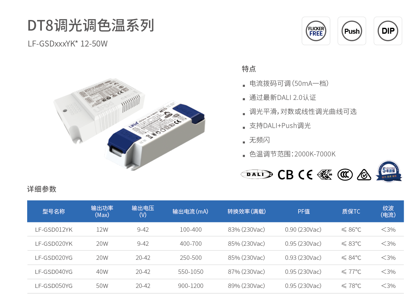 色溫調節又有分段式調節(如三段式、四段式色溫調節)和無極調光調色。兩種調光都是通過驅動實現。以萊福德LF-GIFxxxPA為例,就是是驅動已經設定好3個比例的雙路輸出電流,通過撥碼(按鈕)選擇的其中一個檔位,達到3檔色溫的變化。而LF-GSDxxxYG就是無極調光調色,可以實現色溫在2000K-7000K范圍內的平滑變化(色溫實際能變化范圍最大值由燈具LED光源決定)。