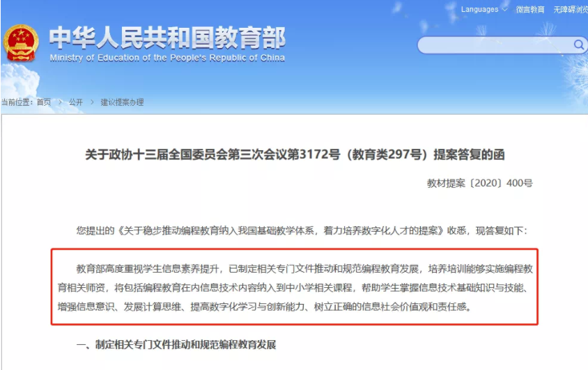 近年來,從中央到地方,陸續出臺了系列推動編程教育的政策和措施。2020 年 11 月 6 日,教育部在最新答復函官宣:編程教育將納入中小學相關課程。這意味著,未來編程課程將進入全國各大中小學校,成為中小學生的必修課。