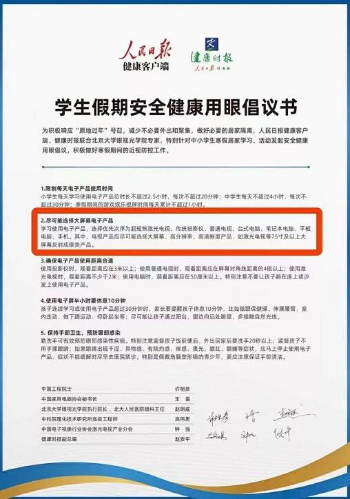 會上,針對假期學生用眼需求,與會專家發起倡議書:需要使用電子產品時,選擇優先次序依次為超短焦激光電視、傳統投影儀、普通電視、臺式電腦、筆記本電腦、平板電腦、手機。其中,電視產品應盡可能選擇大屏幕、高分辨率、高清晰度電子產品,如激光電視等75吋及以上大屏幕反射成像類產品。